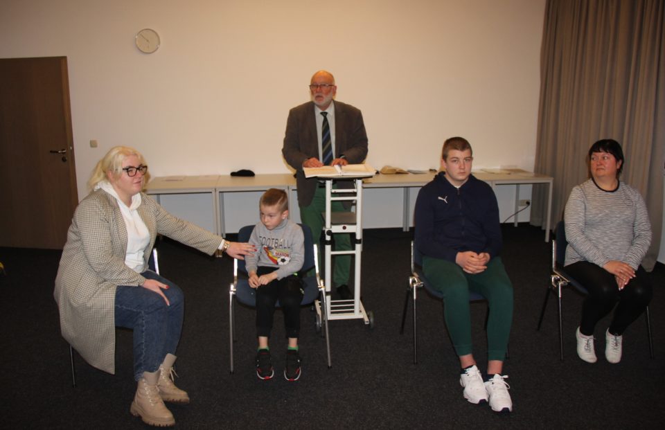 Sie sind vor dem Krieg aus der Ukraine nach Petterweil geflüchtet (v. l.): Viktoria, Dmytro, Rostyslav und Dmytros Mutter Mariia . Dahinter der Mitinitiator der Hilfe »Hoffnung 2022«, Michael Hahn. Foto: Niehoff