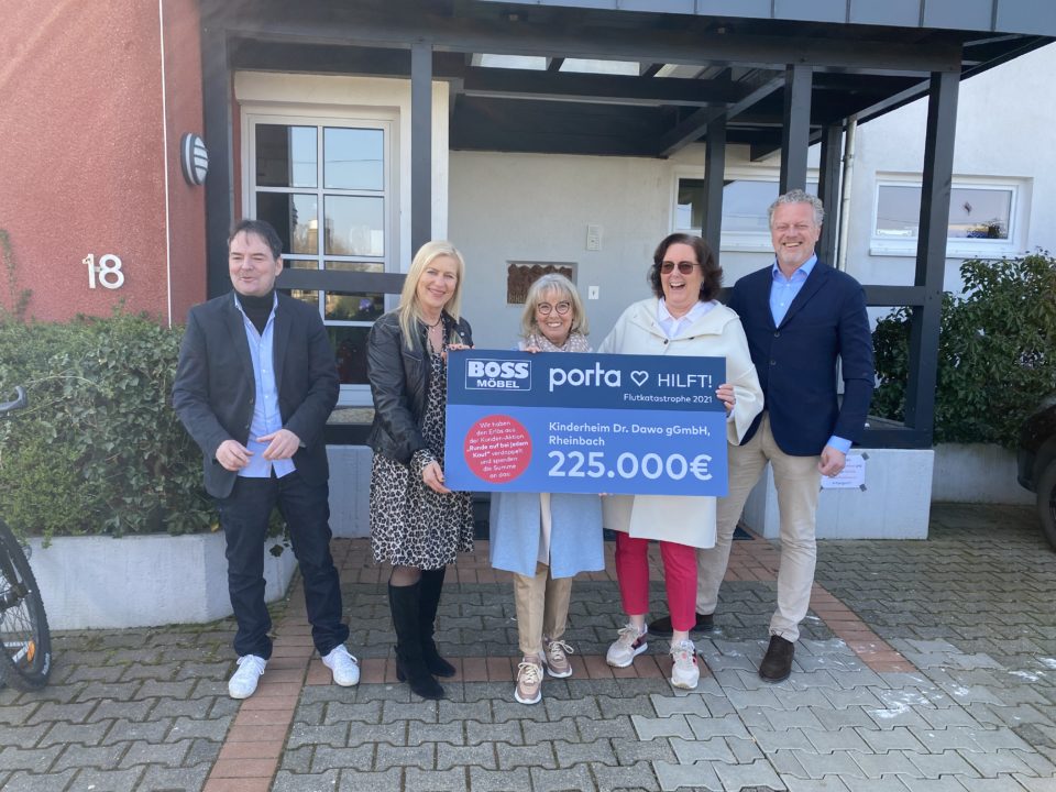 Porta Westfalica/Rheinbach. Die Inhaber und geschäftsführenden Gesellschafter der porta Unternehmensgruppe, Birgit Gärtner und Achim Fahrenkamp, haben kürzlich in Rheinbach einen Spendenscheck in Höhe von 225.000 Euro an die Kinderheim Dr. Dawo gGmbH übergeben. Die Geschäftsführer der Einrichtung, Edith und Oliver Stölben, zeigten sich gerührt und dankbar. Mit dem Geld werden die noch immer stark sichtbaren Folgen der Flutkatastrophe vom Juli 2021 beseitigt. Das Geld wurde im Zuge der »Aktion Aufrunden« in den 26 porta Einrichtungshäusern und mehr als 100 SB-Möbel BOSS Märkten gesammelt. Die Unternehmensgruppe verdoppelte die eingenommene Summe.