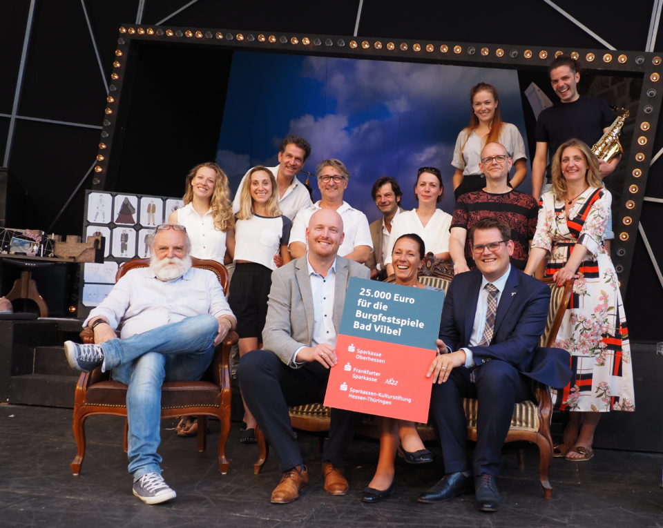 Intendant Claus-Günther Kunzmann und Bürgermeister Sebastian Wysocki begrüßten im Hof der Wasserburg Regionaldirektorin Stefanie Krieg von der Sparkasse Oberhessen und Martin Sänger, Finanzcenter-Leiter Bad Vilbel, der Frankfurter Sparkasse. Das Duo überreichte einen symbolischen Scheck in Höhe von 25 000 Euro der beiden genannten Sparkassen sowie der Sparkassen-Kulturstiftung Hessen-Thüringen. Dafür bedankten sich das Regieteam und das Ensemble mit den erwähnten Songs und Kurzauftritten. (fau)
