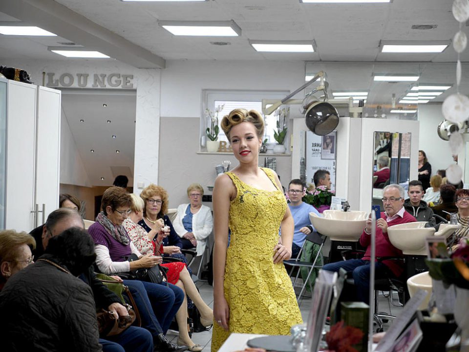 Auf dem Laufsteg präsentierten Tina Daosri, die amtierende Miss Internet, Mitarbeiterinnen der Gräfs und Tochter Felina Gräf (16) die Frisuren- und Kleidermode. Bei den Retro-Kleidern handelte es sich um Leihgaben aus Familien- und Kundenbesitz. Im Anschluss an die Retro-Shows zeigte das seit 20 Jahren bestehende Karbener Braut Studio Zaiger Braut- und Abendmoden.