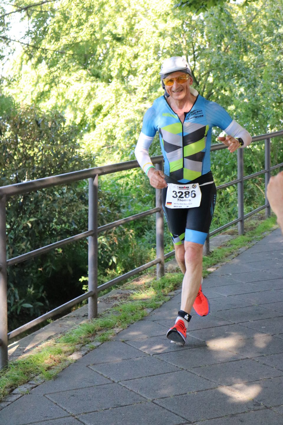 Dabei begann der Tag für Thomas Beisswenger gleich morgens mit einer Panne. Wohl vor Aufregung hatte er seine Badekappe sowie Schwimmbrille in der abgegebenen Tüte vergessen und musste kurz vor Beginn des Rennens Ersatz beschaffen. Zum Glück hielt der Veranstalter Ersatzkappen bereit und ein Sportler schenkte ihm eine Schwimmbrille.