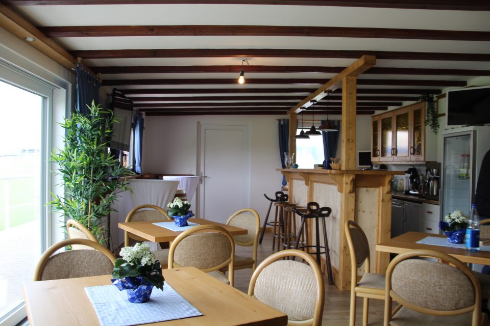 Viel Holz, eine große Terrassentür und Blumen auf den Tischen: die Inneneinrichtung des Vereinsheims des FC Karben kann sich sehen lassen. Foto: Schenk