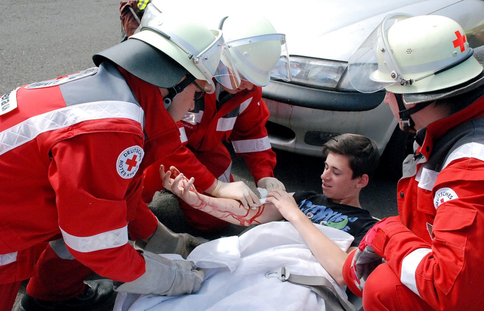 Nidderau. Tobias Beckers liegt blutend auf dem Boden. Bei einem Verkehrsunfall ist der 14-Jährige aus dem Auto geschleudert worden und hat nun eine Risswunde am Oberarm. Bei der 12-jährigen Anna-Zoe Jost stellen die Sanitäter einen offenen Schienbeinbruch fest und ziehen eine große Scherbe aus dem Unterarm. „Das sieht ja unheimlich schmerzhaft aus“, sagt eine Zuschauerin zu ihrem Mann.