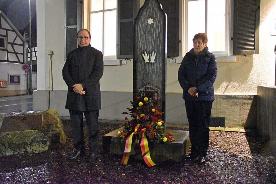 Bürgermeisterin Conny Rück (SPD) und der Vorsitzende der Gemeindevertretung Klaus Ditzel (SPD) legten an der Stele vor dem Rathaus in Büdesheim einen Kranz zum Gedenken an die Opfer nieder. Foto: Lori
