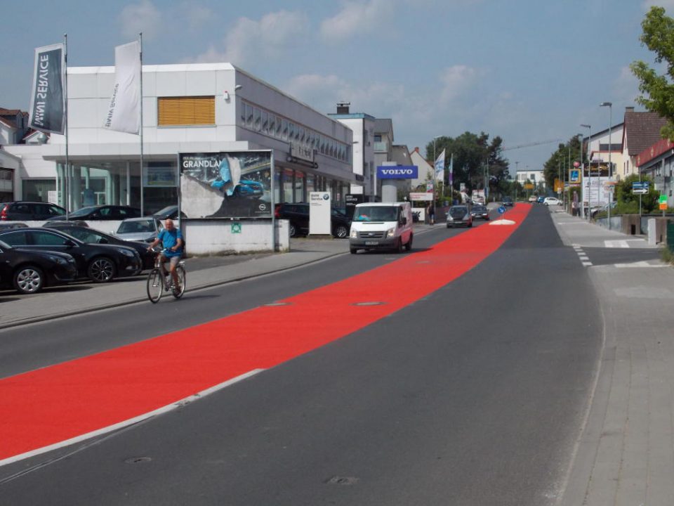 Mit der Markierung des Mittelstreifens in Rot wurden die Arbeiten an der Sanierung der Homburger Straße abgeschlossen. Foto: Neumann