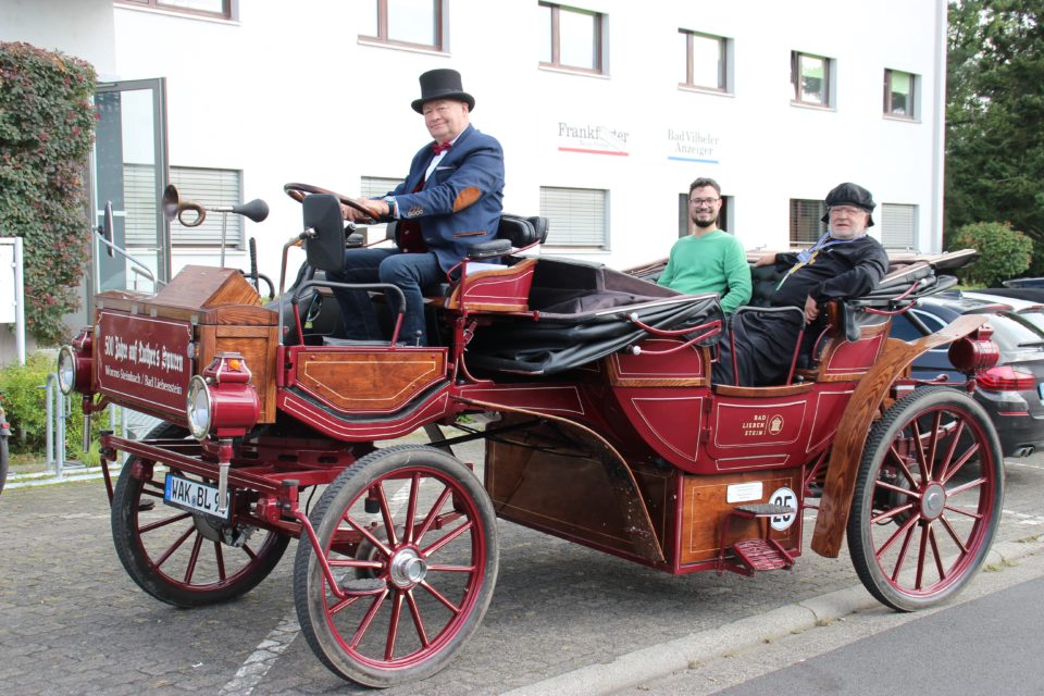 Bad Vilbel. Hupend macht Kutschenlenker Norbert Elzner auf die Pilgergruppe aufmerksam. Er sitzt auf dem Kutschbock einer historisch aufgemachten Kutsche, die allerdings nicht von Pferden gezogen wird. Hier ist laut Auskunft des thüringischen Landtagsabgeordneten Markus Malsch (CDU), Initiator der Reise, »Thüringens erste Elektrokutsche« unterwegs.