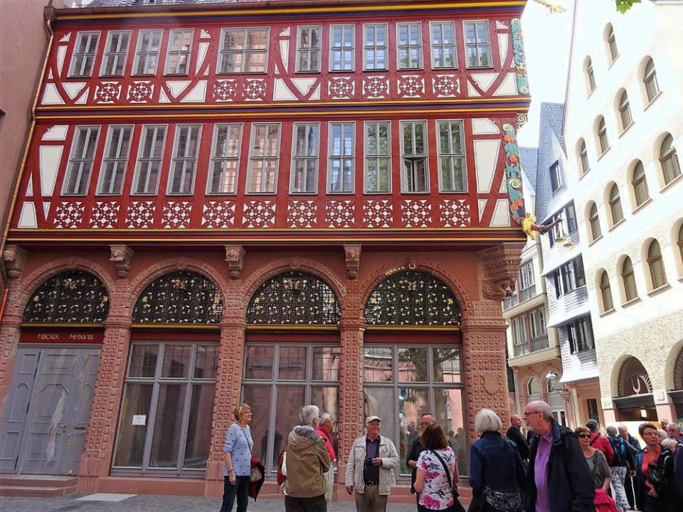 Informiert und geführt wurde die Gruppe von Petra Breitkreuz, der Leiterin des Stoltze-Museums der Frankfurter Sparkasse, das demnächst in der ’neuen Altstadt’, Am Markt 7, wieder eröffnet werden wird. Begonnen hatte der Rundgang am Haus am Dom in der Braubachstraße. Im nahen, ehemaligen Gasthaus ’Zum Rebstock’ wurde Friedrich Stoltze im November 1816 geboren. Eine Gedenktafel erinnert an den berühmten Bewohner, der hier Kindheit und Jugend verbrachte und in der Gaststube mit dem freiheitlichen Gedankengut der oppositionellen ’Demagogen’ in Berührung kam.