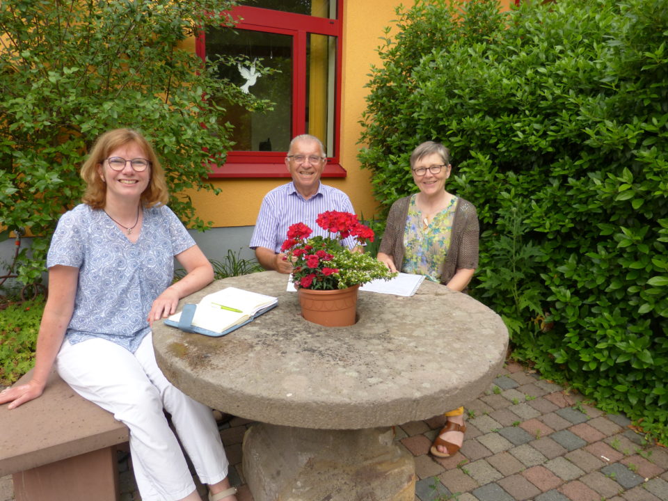 Arbeitstreffen im Freien (von links): Annette Goy (St. Martinus Ober-Erlenbach), Diakon Diethard Fries (Ober-Erlenbach und Burgholzhausen) und Monika Burkard (Gemeindereferentin Bad Vilbel). Foto: Privat