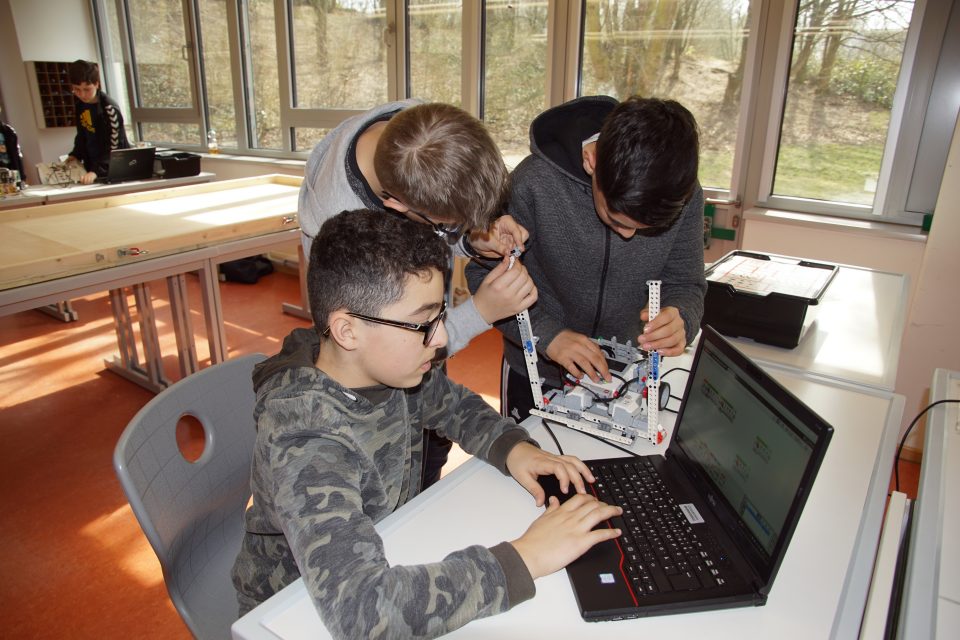 Beim Roboter-Turnier: Nach dem Bau des Roboters wird das Programm geschrieben (von links): Ilias Amini, Jan Grzeszczyszyn und Mehmet Kocahal. Foto: Fauerbach