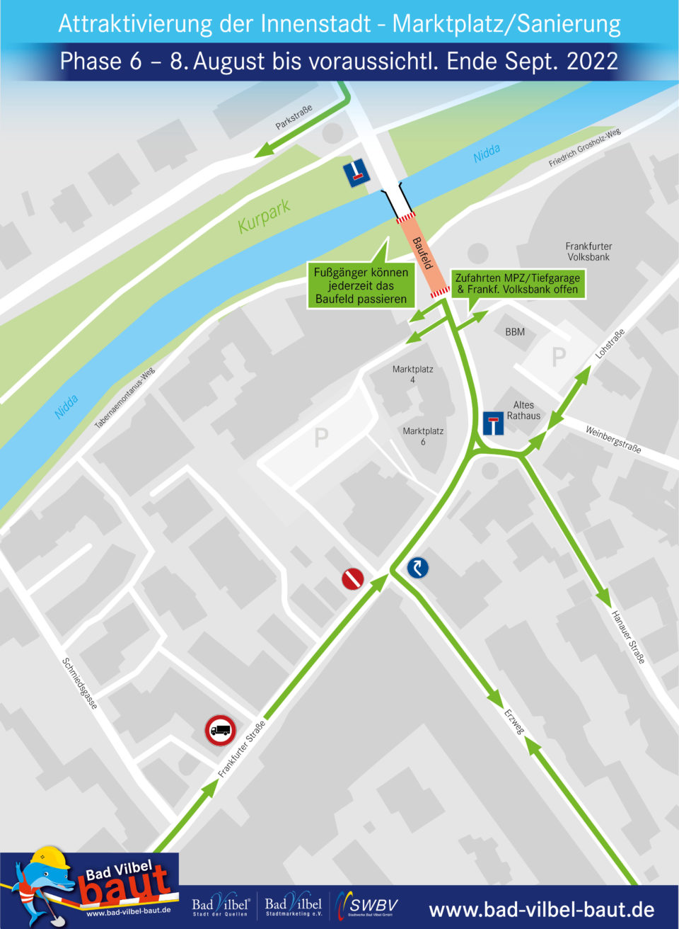 »Das Baufeld zieht nun weiter und liegt ab diesem Datum direkt an der Niddabrücke. Die Tiefgarage Marktplatz sowie die Frankfurter Volksbank sind dann wieder, über die Innenstadt kommend, anfahrbar; auch der Parkplatz (Netto) kann wieder über die reguläre Zufahrt, ab 14 Uhr, angefahren werden, erklärt hierzu Bürgermeister und Verkehrsdezernent Sebastian Wysocki.