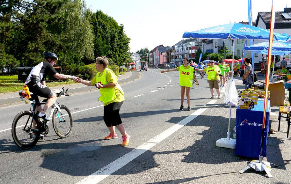 An der Gehspitze vertreten ist die TG Groß-Karben, die das Stimmungsnest ausrichtet. Mit dem Verkauf von Kuchen, Salaten, Gegrilltem und Getränken stärken sie die Besucher. Für die Kinder wurde eine Hüpfburg aufgebaut. „Der Verein ist schon von Anfang an dabei“, berichtet TG-Mitglied Bärbel Grikscheit. Sie wirkte am Stand beim Kuchenverkauf mit. Von den Zuschauern gebe es wieder viel Zuspruch. Außerdem bekomme der Verein bei Transport, Auf- und Abbau Unterstützung von heimischen Unternehmen. Als Ironman-Hauptsponsor ist die Mainova mit einem Gewinnspiel dabei. Auch die Verpflegung der Athleten ist gesichert. Nacheinander können sie nach Wasser, Iso, Cola, Gel, Powerriegeln oder Obst greifen. Dafür stehen die Helfer aufgereiht am Streckenrand und halten den Sportlern all das hin, was sie benötigen.
