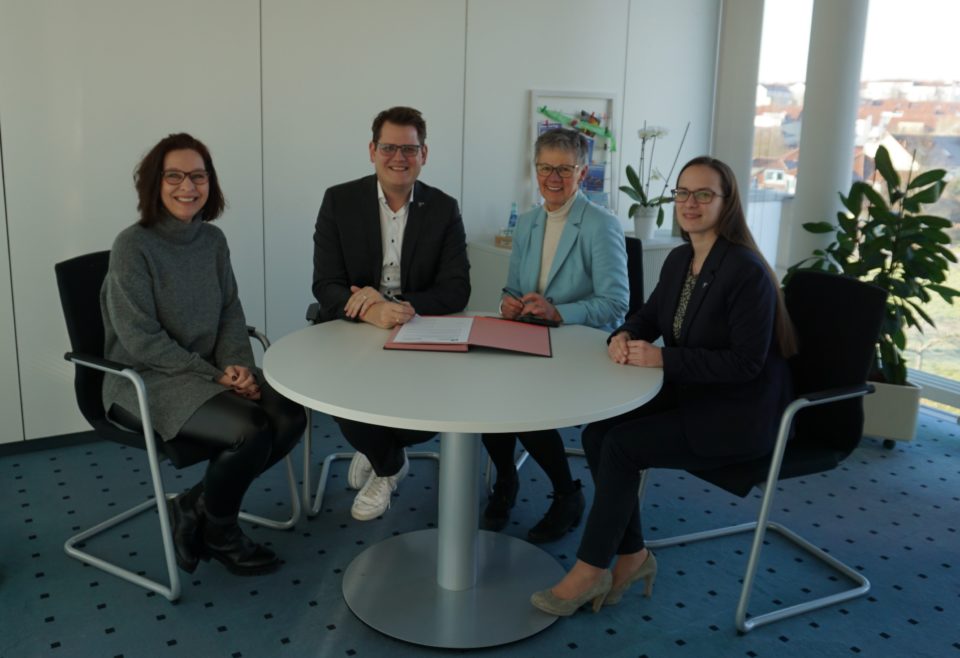 Susanne Förster, städtische Koordinatorin für die Flüchtlingsunterbringung, Bürgermeister Sebastian Wysocki, BFW-Geschäftsführerin Maria Klink und Sozialdezernentin Ricarda Müller-Grimm unterzeichnen den Vertrag. Foto: Privat