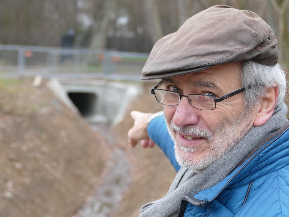 SPD-Stadtverordneter Klaus Arabin macht am Ritterweiher auf mögliche Gefahrenpunkte aufmerksam, hier den großen Kanaldurchfluss vom Graben zum Weiher. Aufrecht könnte ein Kind hindurch laufen, warnt Arabin.