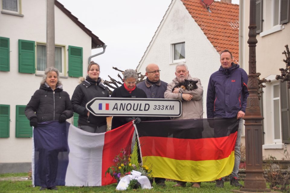 Einen kleinen »Vorgeschmack« auf die geplanten Feierlichkeiten: Vorstandsmitglieder des Vereins »Arbeitsgemeinschaft Städtepartnerschaften Schöneck« fanden sich am Gedenktag an dem Hinweisschild »Anould 333 km«, welches vor dem Büdesheimer Rathaus angebracht wurde, zu einer Feierminute zusammen. Die Stellvertretende Vorsitzende mit dem Fachbereich »Anould«, Virginie Hinkel, hatte eine schmucke Blumenschale unter dem Richtungsanzeiger niedergelegt. Die weißen Bänder trugen in ihrer Aufschrift den Anlass zu der Ehrung: »60 Jahre Deutsch – Französische Freundschaft«.