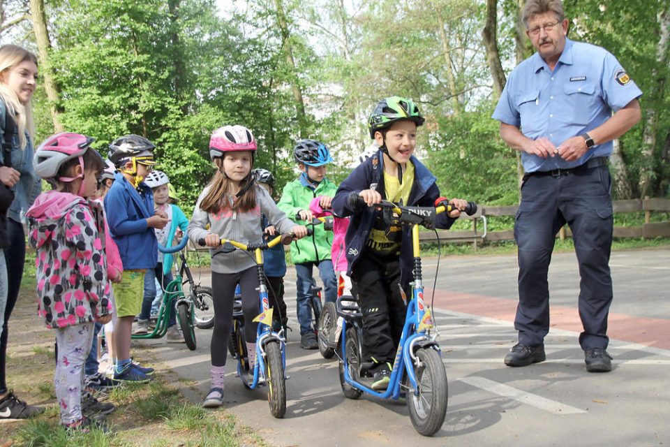 Geduldig warten heißt es immer wieder an der Ampel. Für manche Kinder ist es auch eine Herausforderung, die Fahrspur einzuhalten und immer auf der richtigen Seite zu bleiben. Stadtpolizist Lehnkering muss öfters ans richtige Verhalten erinnern. Mit Geduld und ganz viel Humor.
