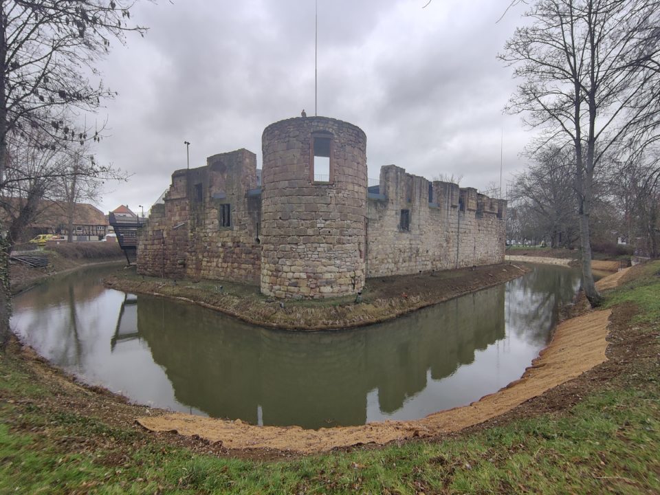 Der Wassergraben rund das historische Gemäuer ist saniert. Der Bewuchs der Ufer wird im Frühjahr während der vegetativen Wachstumsphase beginnen. Foto: Patrick Eickhoff