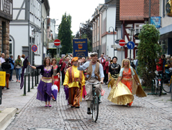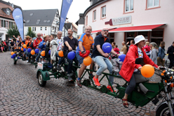 Den Festzug führte Bürgermeister Thomas Stöhr (CDU) wieder in einer Kostümrolle an. Im vergangenen Jahr war es eine Hommage an 100 Jahre Rotes Kreuz in Bad Vilbel. Diesmal trug er das Gewand eines historischen Vilbeler Wasserbuben, auf einem alten Drahtesel, ganz in braun-beige mit Weste und zwei Tonkrügen um den Hals gelegt, als Referenz an die vor 150. Jahrer erfolgte Firmengründung der heutigen „Hassia Mineralqullen“.