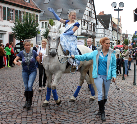 Besonders eindrucksvoll fiel der Auftritt von Quellenkönigin Frida I. aus, die hoch zu Ross auf Primero durch die Straßen ritt, einem andalusischen Showpferd der Rasse Pura Raza Española. Zwei Freunde hätten sie auf die Idee gebracht, erzählt die begeisterte Hobby-Reiterin. Primero habe sie ausgewählt, denn „er ist sehr ausgeglichen und kennt viel Trubel, er war auch schon bei der Pferdenacht in Wiesbaden dabei.“ Auch als Quellenkönigin kommt Frida I. viel herum. Seit ihrem Amtsantritt an Pfingsten hat sie rund 30 Auftritte absolviert.