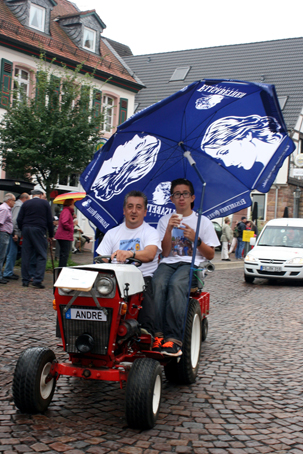 Zuversichtlich gab sich der Kicker-Nachwuchs des FV Bad Vilbel, dessen Banner schon den Weltmeister 2026 ankündigte. Den Preis für die besten Kostüme, so er denn vergeben worden wäre, hätte sich Historica Velwila verdient. Der Bad Vilbeler Mittelalter-Verein zog mit urigen, originalgetreuen Kostümen und einem Mann mit Ehrfurcht einflößender Gesichtsmaske los. Die Mitstreiter trugen stolz ihre Holzlanzen und zogen mit Schafsfellen verzierte Wagen.