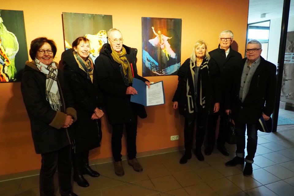Auf die zweite Besonderheit weist der Titel »Weg ins Blaue« hin. »Blau ist die Farbe des Glaubens und der Hoffnung«, betonte Herbert Jung, Pfarrer im Unruhestand. Er war extra aus Mainz gekommen, um gemeinsam mit Jürgen Werner, dem Vorsitzenden des Fördervereins von St. Nikolaus, Dr.-Ing. Dorothea Knoblauch, der stellvertretenden Verwaltungsratsvorsitzenden, und Hanne Mühle vom Förderverein St. Nikolaus, das Ehepaar zu begrüßen. Und ihnen für die Unterstützung beim Kunstkauf zu danken.