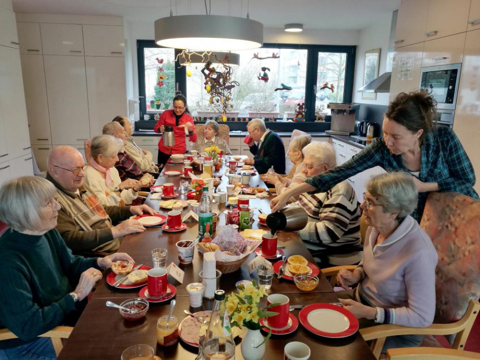 „Das Mittagessen kommt aus der Küche des Pflegeheims, aber wir kochen immer unsere Kartoffeln selbst, jeden zweiten Tag backen wir“, erklärt Pflegekraft Elke Rachtahl. Nach Morgenkreis, Essen und Mittagsruhe wird dann gemeinsam gebastelt – passend zur Jahreszeit etwa die Osterdekoration – oder gespielt.