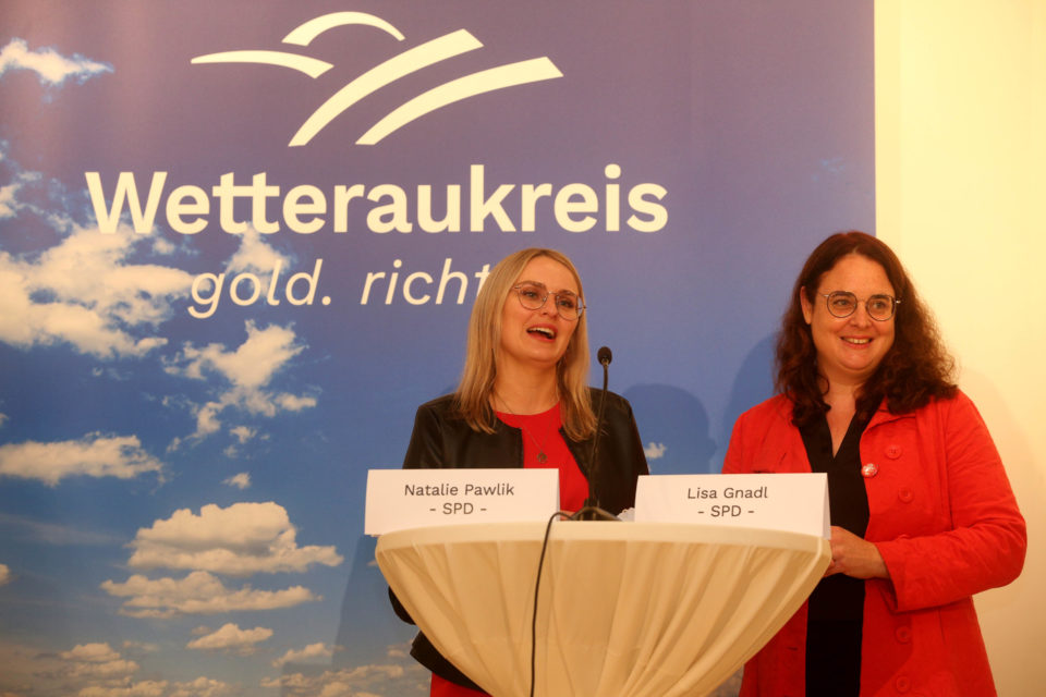 Die künftige Bundestagsabgeordnete Natalie Pawlik und die Wetterauer SPD-Vorsitzende Lisa Gnadl freuen sich im Friedberger Kreishaus nach der Auszählung über den Wahlerfolg ihrer Partei. Foto: Nicci Merz