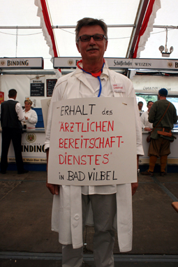 Zuvor hatte im gut gefüllten Festzelt der SPD-Ortsvorsitzende Udo Landgrebe für eine politische Note gesorgt. Er war als Sandwich-Mann mit Plakaten unterwegs. Verkleidet ganz in Weiß als Doktor, forderte er den Erhalt des Ärztlichen Notdienstes in Bad Vilbel.