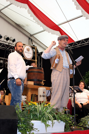 Dann ging es auch schon an das kleine Fass, das es anzustechen galt. Ein diesmal sehr routiniertes Ereignis. Assistiert von Hermann Brausch von der Binding-Brauerei, traf Stöhr schon beim dritten Anschlag mit dem Holzhammer ins Ziel, das Pils begann zu fließen.