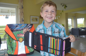 Die größte Leidenschaft kann er aber auch gleich hinter dem Haus ausleben; denn dort auf dem Rasen stehen zwei Tore, und auf diesem kleinen Fußballplatz toben sich Julius und Justus gemeinsam mit Freunden regelmäßig aus. Wie sein Vater Johannes, so ist auch Julius ein großer Gladbach-Fan. Und natürlich blinkt auch auf seinem Schulranzen ein Fußballer hervor, noch passender ist aber die Schultüte gehalten: ganz in Grün, Schwarz und Weiß, den Vereinsfarben von Borussia Mönchengladbach, außerdem ist der Einschulungstag und der Name „Julius“ mit großer weißer Schrift zu lesen. So schön das elterliche Anwesen auch ist, es hat auch einen Nachteil. Während die anderen Kinder der Dortelweiler Regenbogenschule nach gut drei Wochen in der Regel allein zu Fuß zur Schule gehen sollen, ist das für Julius noch nicht möglich.