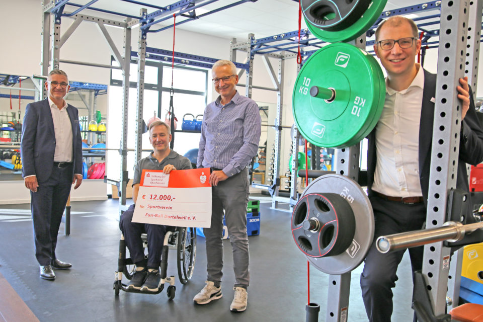 Bad Vilbel. Vor fast genau einem Jahr wurde im neuen Bad Vilbeler Wohnquartier Quellenpark ein großes neues Sportzentrum eröffnet: In dem multifunktionalen und barrierefreien Gebäude nutzen die Bürgerinnen und Bürger der Quellenstadt Gesundheits- und Fitnesskurse oder auch Tanzangebote. Für die Ausgestaltung dieses Angebotes übergaben der Vorsitzende der Stiftung der Sparkasse Oberhessen, Landrat Jan Weckler und Frank Dehnke, geschäftsführendes Vorstandsmitglied der Stiftung, 12.000 Euro an den SV Fun-Ball Dortelweil. Der Verein ist Bauherr des neuen Sportzentrums. Das Geld wird für ein abwechslungsreiches Geräteangebot genutzt.