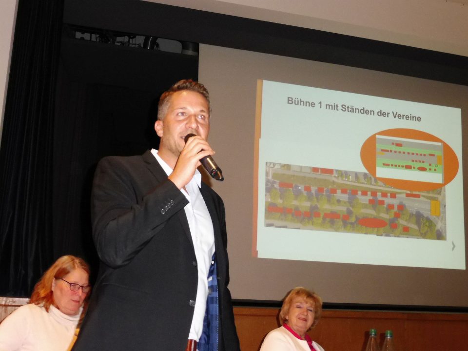 Oliver Becker ist von der Stadt als Organisator für die 50-Jahr-Feiern Karbens engagiert worden. Bei der Bürgerversammlung stellt er das Programm vor. Foto: Pegelow