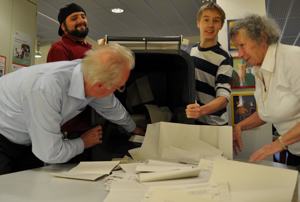 „Wir sortieren zunächst nach gültigen und ungültigen Stimmen“, erklärt Wahlleiter Nölke. Schimpfwörter und Kurioses seien eher selten, meist machten unzufriedene Wähler ihre Stimmzettel ungültig, indem sie die Parteien durchstrichen oder gleich mehrere ankreuzten. Einer der Helfer hält einen Wahlzettel hoch. „Der hier ist ungültig, da hat jemand ein Blümchen draufgemalt. Ich frage mich, warum solche Leute überhaupt wählen gehen.“ Ibrahim Çiçek widerspricht entschieden: „Hauptsache, sie gehen überhaupt wählen“, findet er.