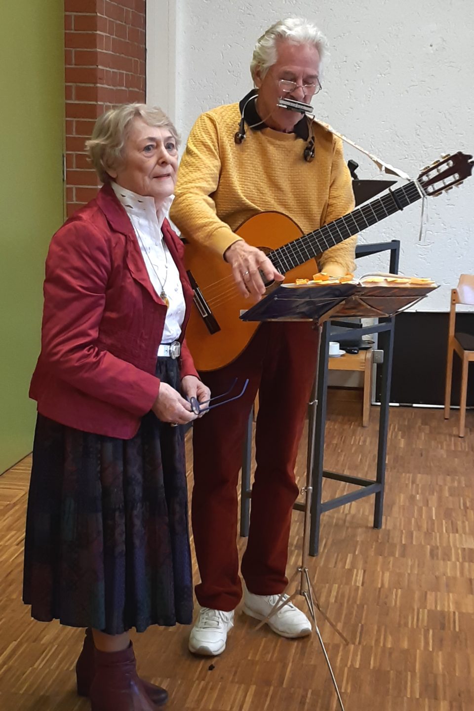 Eine wunderbare Überraschung war der Auftritt des Ehepaares Edelgard und Lothar Halaczinsky aus Rosbach. Edelgard Halaczinsky trug Frühlings-Lieder vor, die von Lothar Halaczinsky auf der Gitarre und mit der Mundharmonika begleitet wurden. Zwischendrin wurde etwas über die Entstehung der Lieder erzählt.