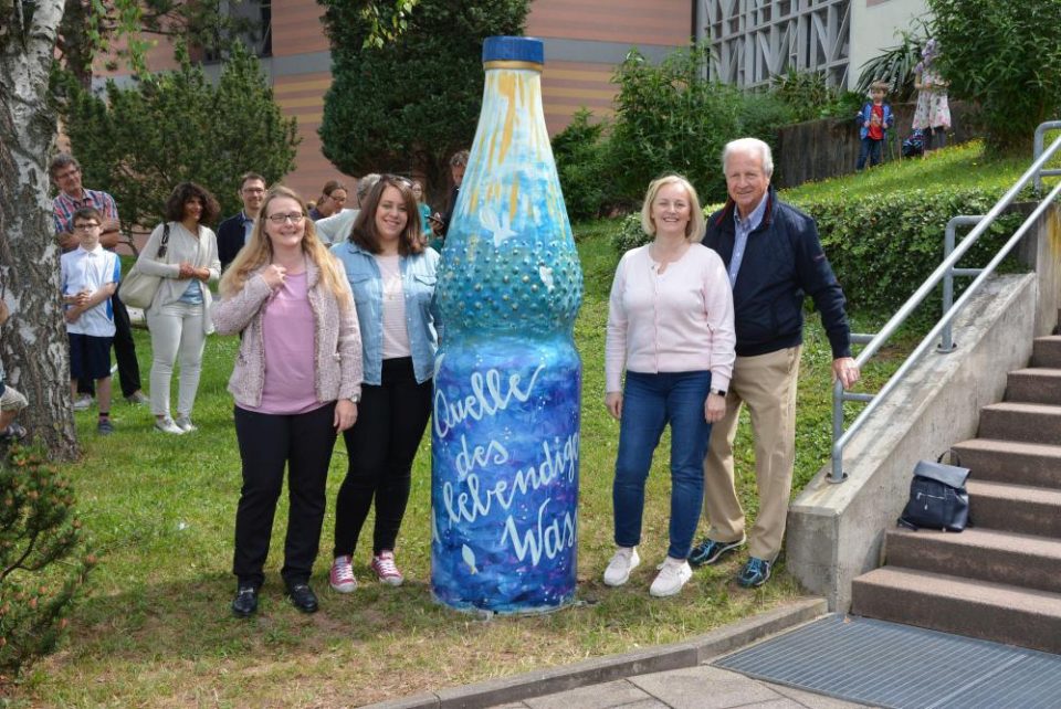 Man habe schließlich damit begonnen, die Flasche zu bemalen. „Wunderschön“, wie May sagte. Für die Bemalung seien Astrid Edelmann, Fiona Giese, Annika Küss, Nadine Schwarz und Anja Seybold zuständig gewesen. „Wir haben uns natürlich zuvor Gedanken gemacht, wie die Flasche aussehen könnte“, sagt May. Die Quelle sei nun oben am Flaschenhals zu sehen und gehe in goldenen Strahlen nach unten. „Die kleinen Fische sind die Christen, sie streben nach oben“, erläutert die Pfarrerin. Der Schriftzug „Quelle des lebendigen Wassers“ rundet das Design der Flasche ab. „Das ist wirklich toll gelungen“, lobte Hassia-Seniorchef Hinkel.