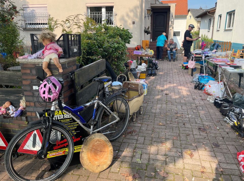 Nebenan gibt es historische Kinderwagen und Barbie-Puppen. Emely Landmesser sitzt mit ihrem Opa Kurt Füll (89) auf einer Gartenbank vor dem Haus und genießt den milden Spätsommertag. »Wir machen das, weil es praktisch ist. Wir gehen auf den Dachboden und räumen alles aus«, sagt Landmesser. Die Veranstaltung werde gut angenommen. Die Leute gingen spazieren und informierten sich nebenbei. Vorwiegend Kleidung und Schuhe sowie Deko-Material türmen sich im Hof. Landmesser sagt, dass es nach den Lockdowns wieder schön sei, den Leuten aus Okarben zu begegnen und sich zu unterhalten. Kevin Kalesse hofft auf Käufer für CDs, Teller, Spielsachen, Bücher und Puzzle, Schuhe und Modellautos.