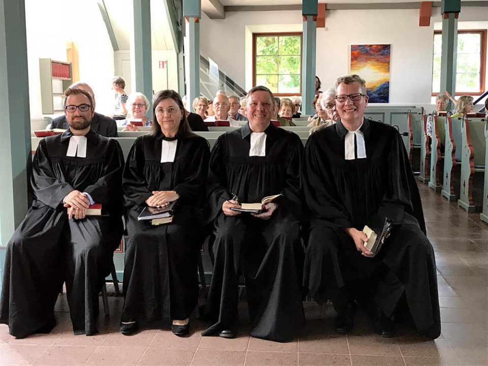 Drei Pfarrer und eine Pfarrerin hielten schließlich Fürbitte und Gebet, ehe Pfarrer Burgdorf den Festgottesdienst mit dem Segen beendete. Anschließend wurde bei hochsommerlichen Temperaturen in den Gemeindegarten geladen, wo bei Kaffee und Kuchen Abschied genommen und kennengelernt werden konnte. (zlp)