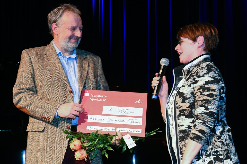Doch Kunst und Kultur brauchen Förderer. Zu Beginn des Abends überreichten Monika Delazer und Sabine Krassmann vom Bad Vilbeler Gewerbering einen Scheck über 3022 Euro. Dieser Betrag war bei der Weihnachtsbaumaktion des Gewerberings zusammengekommen. 30 Geschäfte des Gewerberings hatten sich an dieser Aktion für den Sozialfonds der Burgfestspiele beteiligt. Der Sozialfonds ermöglicht Theaterbesuche in der Burg für Kinder, die sonst aus finanziellen Gründen nicht ins Theater gehen können. Im Namen aller Kinder, denen der Sozialfonds das Erlebnis einer Vorstellung in der Burg ermöglicht, dankte Michael Döricht, den beiden Initiatorinnen dieser Weihnachtsbaumaktion.