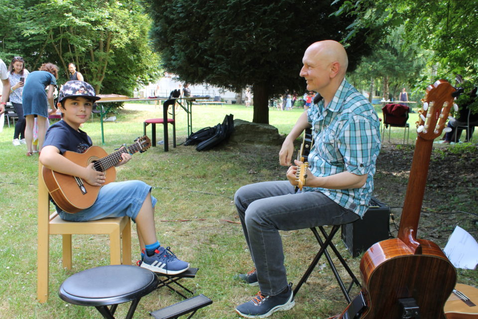 David, acht Jahre, möchte nach den Sommerferien ein Instrument lernen. Die Gitarre gefällt ihm, aber er ist sich noch nicht sicher. Gitarrenlerher Ralf Füsser unterrichtet das Instrument schon lange. Foto: Dostalek