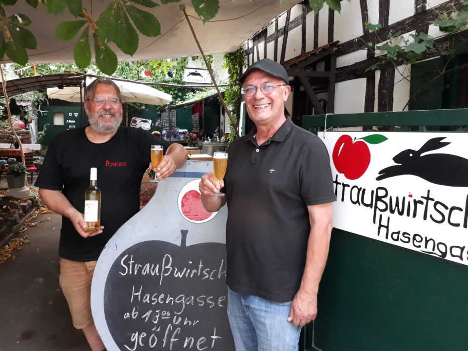 Jürgen Pfeiffer (links) und Wolfgang Lazar feierten den Gewinn ihrer CiderWorld-Medaillen in der Straußwirtschaft in Bad Vilbels Hasengasse. Foto: Hirschmann