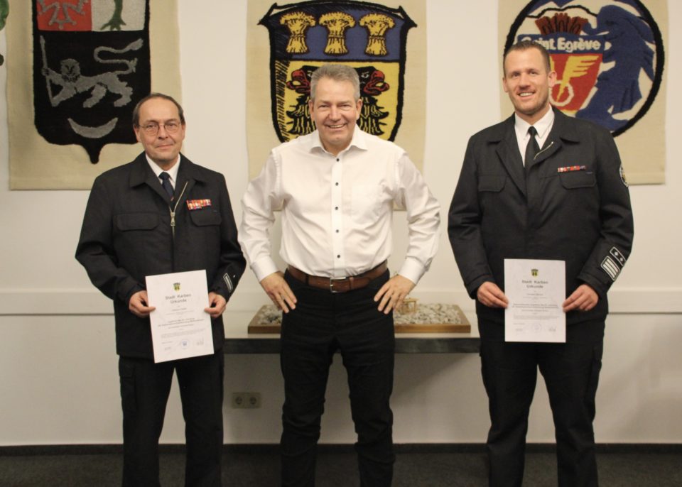 Seit fünf Jahren ist der Petterweiler Feuerwehrmann Hartmut Töpfer Zugführer des Katastrophenschutzlöschzugs in Karben. Nun wurde ihm für diese ehrenamtliche Arbeit von Bürgermeister Guido Rahn und Stadtbrandinspektor Christian Becker gedankt und Hartmut Töpfer wurde für weitere fünf Jahre erneut zum Zugführer ernannt. Christian Becker fungiert, wie schon in den zurückliegenden fünf Jahren, als stellvertretender Zugführer.