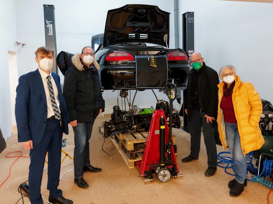 Dr.-Ing. Vitali Kudaschov, Andreas Lohbeck, Clemens Breest und Isil Yönter (v. l.) an einem umgerüsteten Sportwagen. Foto: Privat