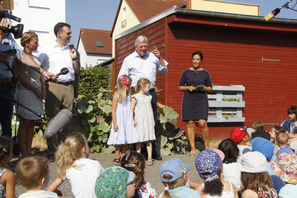 Bad Vilbel. Besser kann man sich den Auftakt einer politischen Sommerreise wohl nicht wählen: Ministerpräsident Volker Bouffier will im Landtags-Wahljahr Werbung für seine CDU machen. Und da seit dem 1. August sechs Stunden Betreuung in Kitas auf seine Initiative hin kostenlos sind, hat sich Bouffier eine Vorzeige-Kita im vergleichsweise wohlhabenden Bad Vilbel ausgesucht, um dort mit einem großen Mediengefolge per Bus vorzufahren.