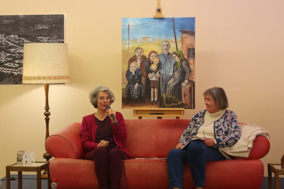 Auf dem roten Sofa besprach Steppan mit der Künstlerin das gesamte Werk bis ins kleinste Detail. Neumann erzählte, dass sie das Thema »Ankommen« ganz eng gesehen habe. Sie habe zurückgezogen gearbeitet und oft melancholische Musik gebraucht, um die Stimmung im Bild richtig darstellen zu können.