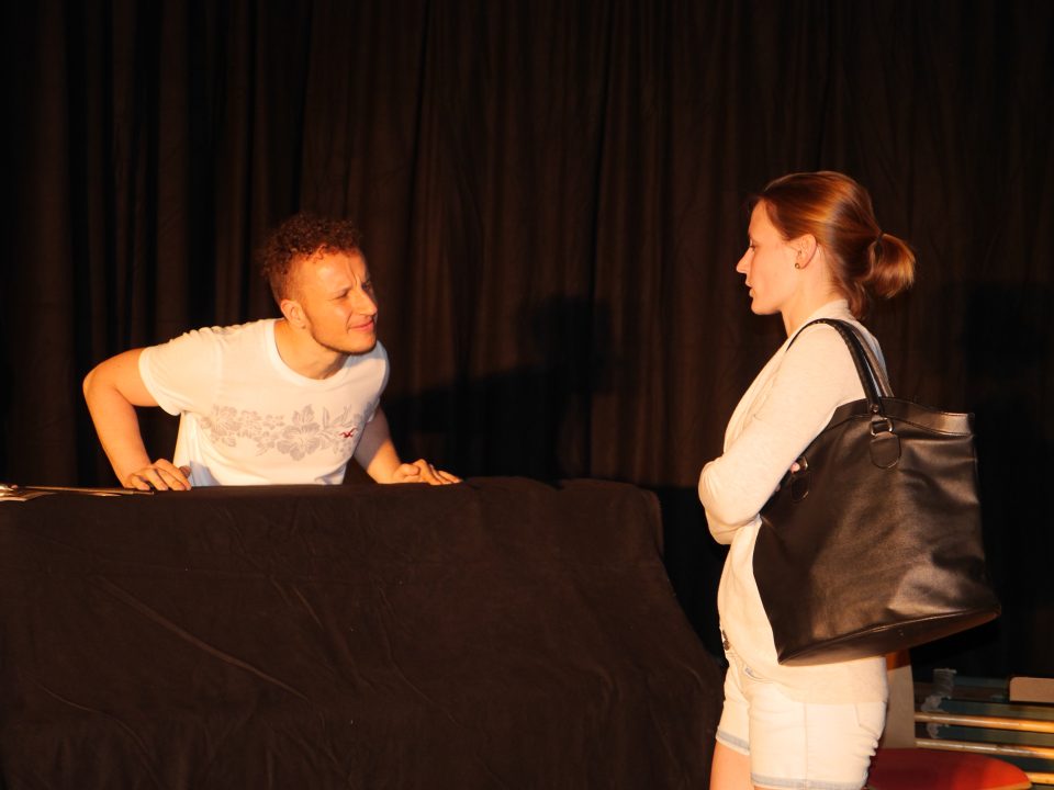 Amüsiert werden darf sich bei dem Zungenbrecher-Stück „Rhabarberbarbara“, dass sich spielerisch mit der deutschen Sprache auseinandersetzt. Erzählt wird die Geschichte von Rhabarber-Barbara, die in ihrem Dorf eine Bar eröffnet, in die ihr Freund kommt wie auch drei Barbaren. In „Einkaufsrealität“ entführt Ehemann Jochen in ein Leben mit einer kaufsüchtigen Ehefrau. Amüsiert werden darf sich auch im Stück „Philosophischer Knochen“, in dem ein Metzger und seine Kundin perfekt aneinander vorbeireden. (fau)