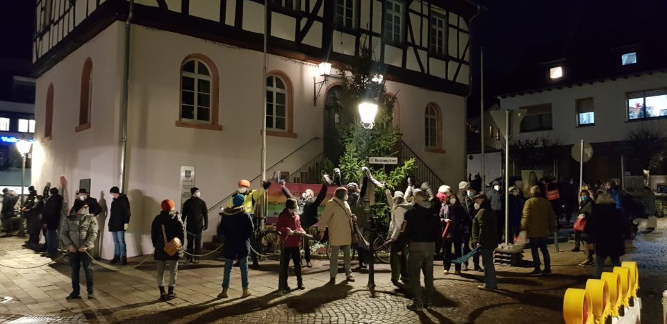 Ungerer ruft zudem dazu auf, auch in den kommenden Wochen zum Gegenprotest bereit zu sein. Nächster Termin ist am kommenden Montag, 17. Januar, 17.30 Uhr, vor dem Alten Rathaus.Sie suche derzeit noch nach Personen, die ein kleines Team bilden wollen, um kreative und coronasichere Aktionen zu organisieren, sagt Angelika Ungerer. Eine Menschenkette war es am vergangenen Montag, mit Absperrbändern und Schals werden Abstände zwischen den Personen markiert. Einmal um den Marktplatz und das Alte Rathaus herum stehen die Vilbeler, haben Flaggen mit Regenbogenfarben und Schilder dabei.