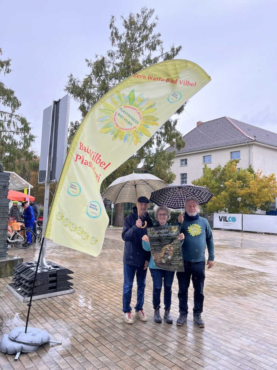 Die Nachhaltigkeitsmesse fällt ins Wasser, die Nachhaltigkeitswoche findet aber wie geplant statt. Darauf freuen sich (v. l.) Kalle Heitmüller, Martina Faltinat und Olaf Deller vom Netzwerk »Bad Vilbel Plastikfrei«. Foto: Kauer