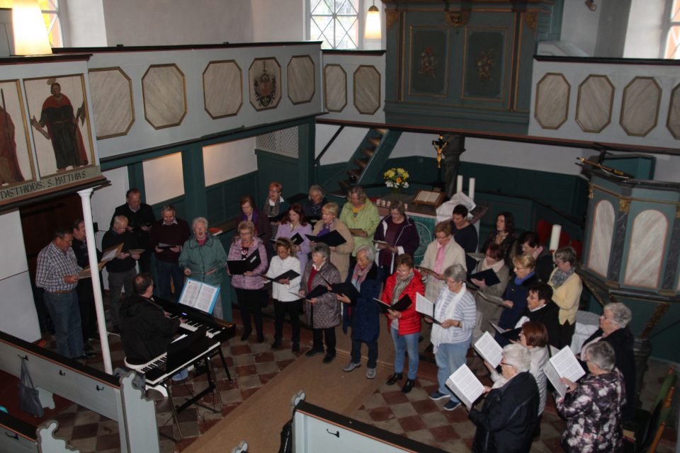 Am vergangenen Samstag traf man sich in der evangelischen Pfarrkirche in Burg-Gräfenrode zur Stell- und Gesangsprobe. Für einen geplanten Auftritt am ersten Adventssonntag ging es erst einmal darum, die passende Aufstellung zu finden. Körpergröße und Stimmlage spielten hierbei eine entscheidende Rolle. Die Männer stellten sich neben dem linken Seiteneingang der Kirche auf und die Frauenstimmen entlang des Altars bis unter die Kanzel. Sechs Lieder sollen am ersten Dezember abends im Gottesdienst gesungen werden.
