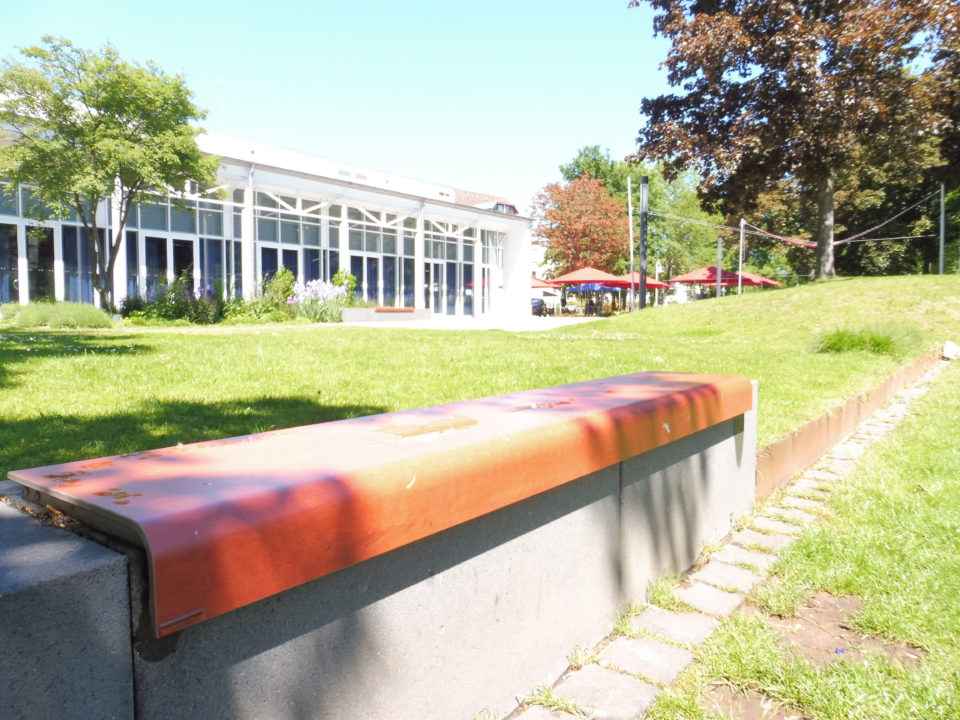 Dafür ist viel gebaut worden. Es wurde ein moderner, gleichwohl nicht gesichtsloser Platz hinter dem großen Saal des Bürgerzentrums angelegt. Mit einer kleinen Bühne, mit Technik, um ein paar Verstärker anzuschließen oder eine mobile Zapfanlage für die Gastronomie. Für diejenigen, die mit dem Fahrrad kommen, gibt es rund 30 Abstellplätze und eine Ladestation für Elektro-Fahrräder. Seniorengerecht hohe Bänke laden ebenso zum Verweilen ein wie Sitzgelegenheiten auf Quadern nahe dem Ufer.