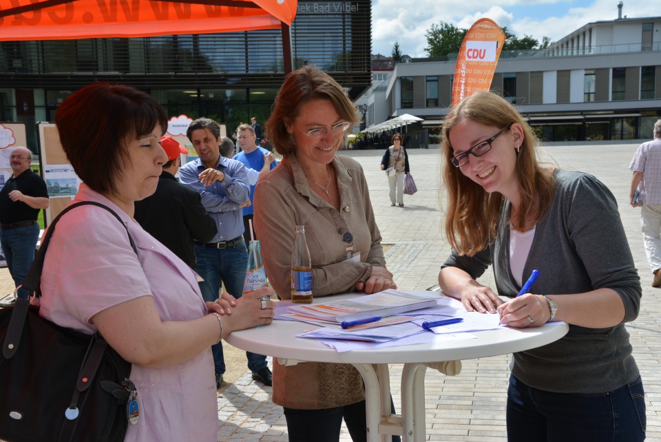 Mit Plakaten und Ständen informieren die Christdemokraten über die Entwicklungen beim Bau der Kreisel auf der Homburger Straße, dem geplanten Kombibad und natürlich über den Haushalt und die Flüchtlinge. Die Fraktionsmitglieder und auch die Mitglieder der Jungen Union standen für Diskussionen und bei Fragen zur Verfügung. Das geschah bei bestem Wetter auf dem Vorplatz des Kurhauses. Besonders im Mittelpunkt stand an diesem Tag aber die geplante Auflösung des ärztlichen Notdienstes, zum 1. Juli. In einem Schreiben von vergangener Woche hatte die Kassenärztliche Vereinigung erklärt, dass der Bereich Bad Vilbel mit rund 31 800 Bewohnern und 44 Ärzten zu klein sei, um bestehen zu bleiben. Hintergrund ist eine Reform des ärztlichen Bereitschaftsdienstes, nach der die Vertragsärzte neu organisiert werden. Durch diese Neuordnung sollen immobile Patienten nicht mehr so lange auf Hausbesuche warten müssen, mobile Patienten hätten aber längere Wege zurückzulegen. Bis 2015 sollen diese Umstrukturierungen abgeschlossen sein.