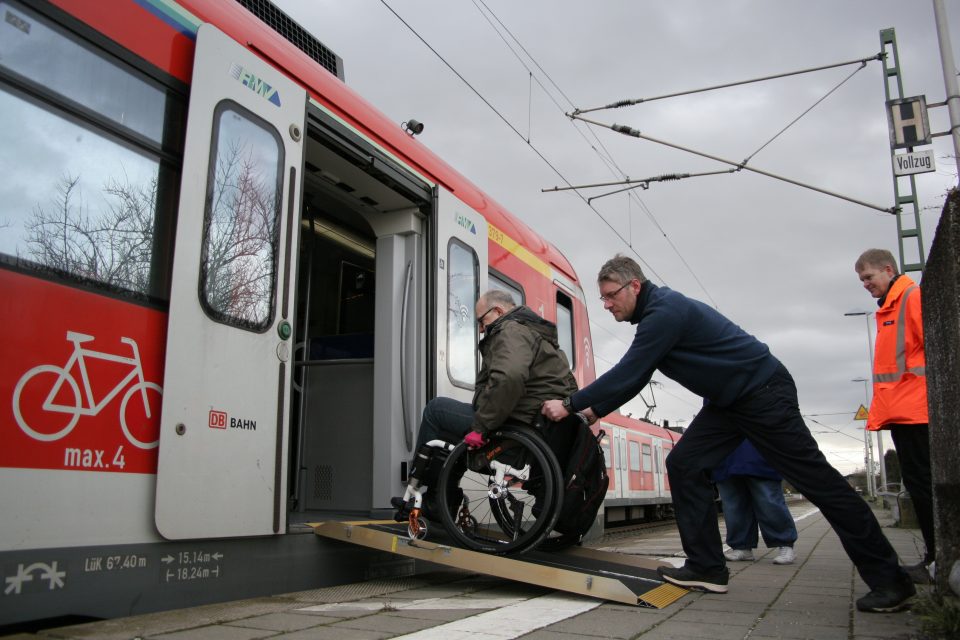 Diese Zeitung machte im Juli mit Vertretern des VdK Karben und Wetterau sowie der Stadt den Praxistest. Dabei stellte sich heraus, dass Rollstuhlfahrer in den Stadtbus bequem über eine vom Fahrer ausgeklappte Rampe hinein und in Okarben auch wieder herauskommen können. Am Bahnsteig 1 war jedoch Schluss. Reiner Weber vom VdK Friedberg konnte nicht hineinrollen. Das lag an dem zu hohen Bahnsteig. Doch Weber und die Kreisvorsitzende Ellen Benölken ließen nicht locker und wandten sich an die Bahn. Die entsandte am Mittwoch Lars Brüning nach Karben. Er wies auf etwas hin, das so noch gar nicht bekannt ist: »Alle S-Bahnen verfügen über eine ausklappbare Rampe.« Die Lokführer seien angehalten, sie auszuklappen, um Rollstuhlfahrern den Einstieg zu ermöglichen.